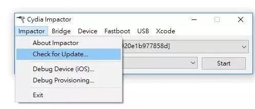 在电脑上开启Cydia Impactor工具,点击「Impactor」>「Check for Update…」。