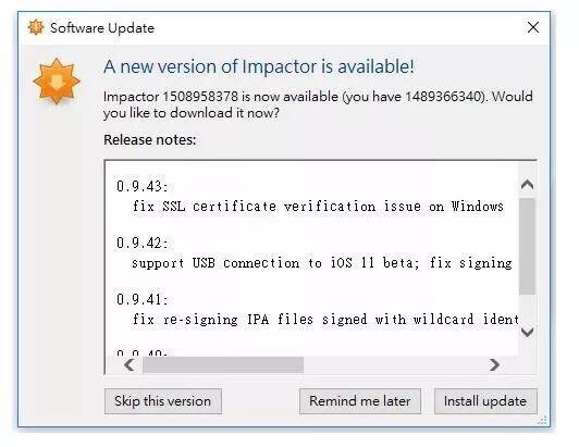 跳出更新窗口,直接点下「Install update」按钮会自动下载新版 Cydia Impactor ,移除旧程序,改用新版开启即可。