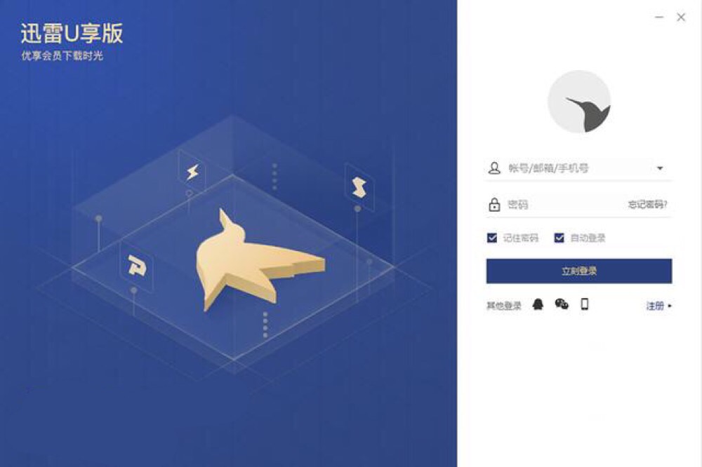 迅雷U享版采用皇家贵族蓝与会员专属淡淡的玫瑰金色,登录界面也十分简约,做到了适当的留白。