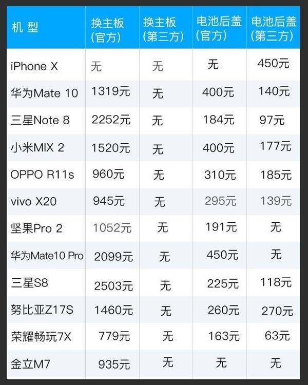 虽说智能手机上最容易损坏的就是屏幕了,但也不排除像摄像头、电池、主板、后盖这些部分有损坏的可能,下面就让我们再通过两张表一起了解下上述几部分如果坏了,我们在维修时需要准备好多少银子。