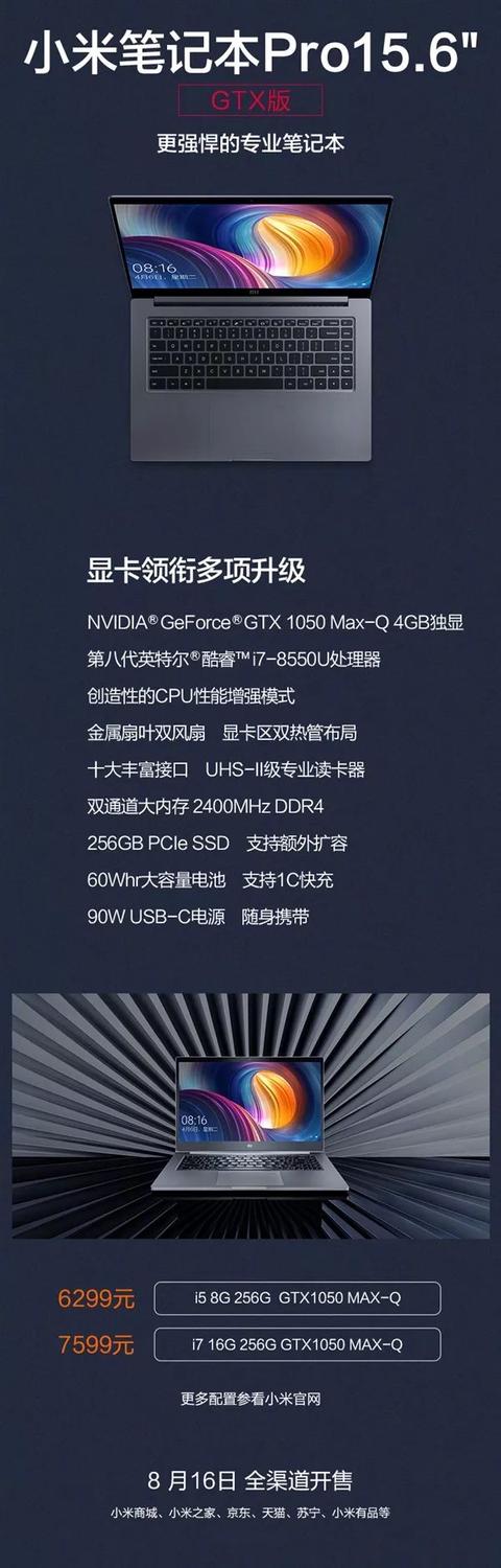最后是价格,小米笔记本Pro GTX版将于8月16日在小米商城、小米之家、京东、天猫、苏宁、小米有品等渠道全平台同步开售,i5+8GB内存版售价6299元,i7+16GB内存版售价7599元。