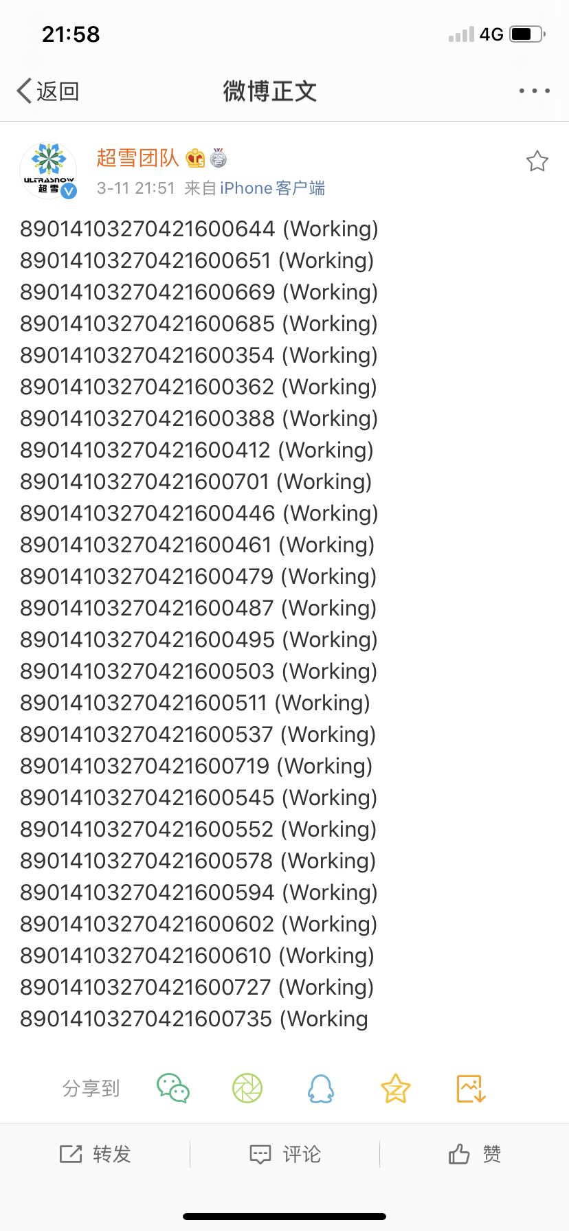 没想到今天ICCID解锁突然复活,超雪团队今天下午发博称,iPhone卡贴机可以完美激活了,不过他们也提醒大家抓紧时间激活,苹果是否会再次封堵还是个未知数。