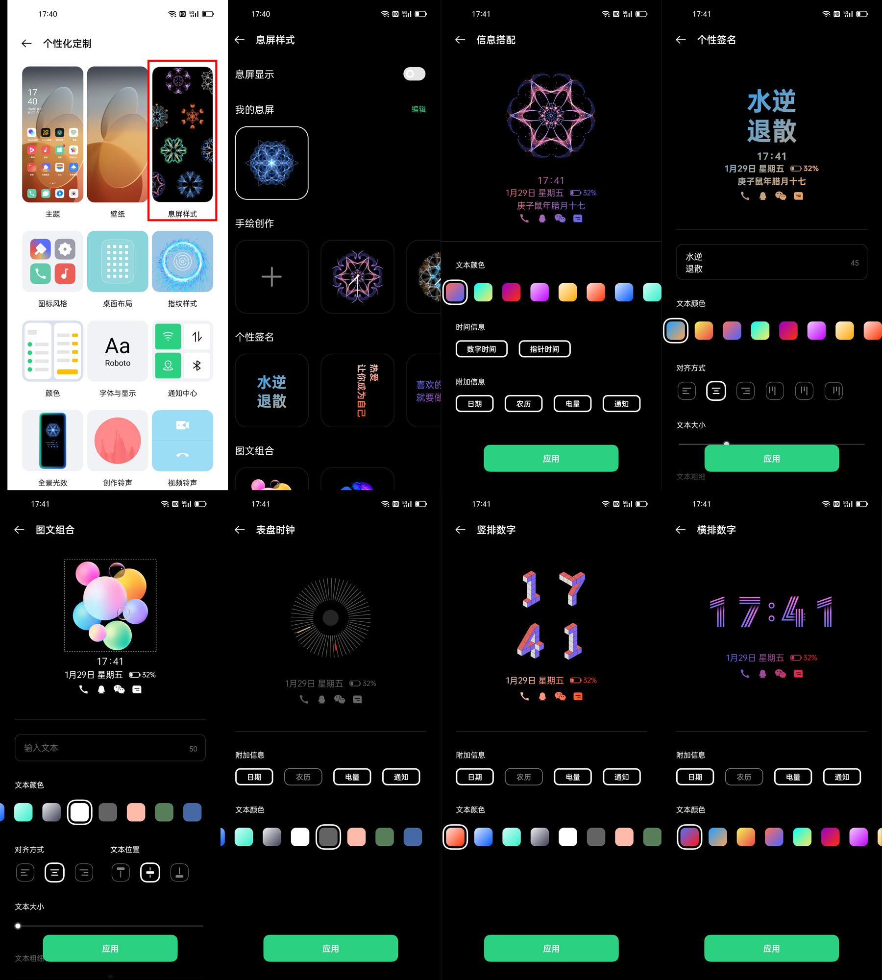 操作同样很简单,在打开息屏设置后,我们可以选择图案创作,根据个人喜好添加时间显示方式、文本颜色和附加信息,之后就能够通过指尖滑动或旋转,根据自己的想法来完成息屏界面的绘制,自动生成一个个性化十足的息屏图案,自由度非常的高,让每个用户的个性与创意在方寸之间尽情显现。