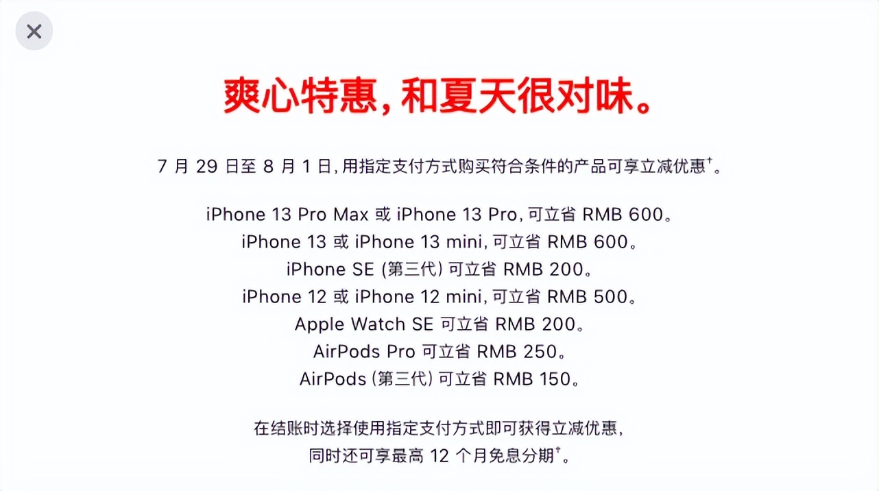 尽管苹果在今年的智能手机市场上基本已经没有对手,但也并不妨碍其再出新招,让销量再度拔高几层。苹果在今日公开了夏日优惠活动,消费者通过指定的支付方式即可在购买iPhone 13、iPhone 12、Apple Watch SE以及AirPods Pro和AirPods 3等产品时获得优惠减免,而官网中提到的“指定支付方式”其实就是与苹果有合作的那几家分期付款机构,当然,在获得优惠的同时,12期免息依然是可用的。