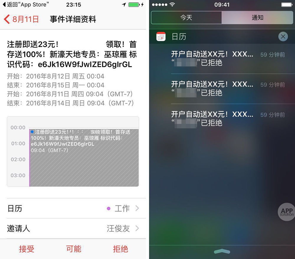 他们只需打开 iOS 自带的日历应用,创建一个日程,「标题」位置写上广告内容,设置好「开始」和「结束」时间,再把一批 Apple ID(一般与 iCloud ID 一致)填入「被邀请人」的位置……一次轰炸就完成了。